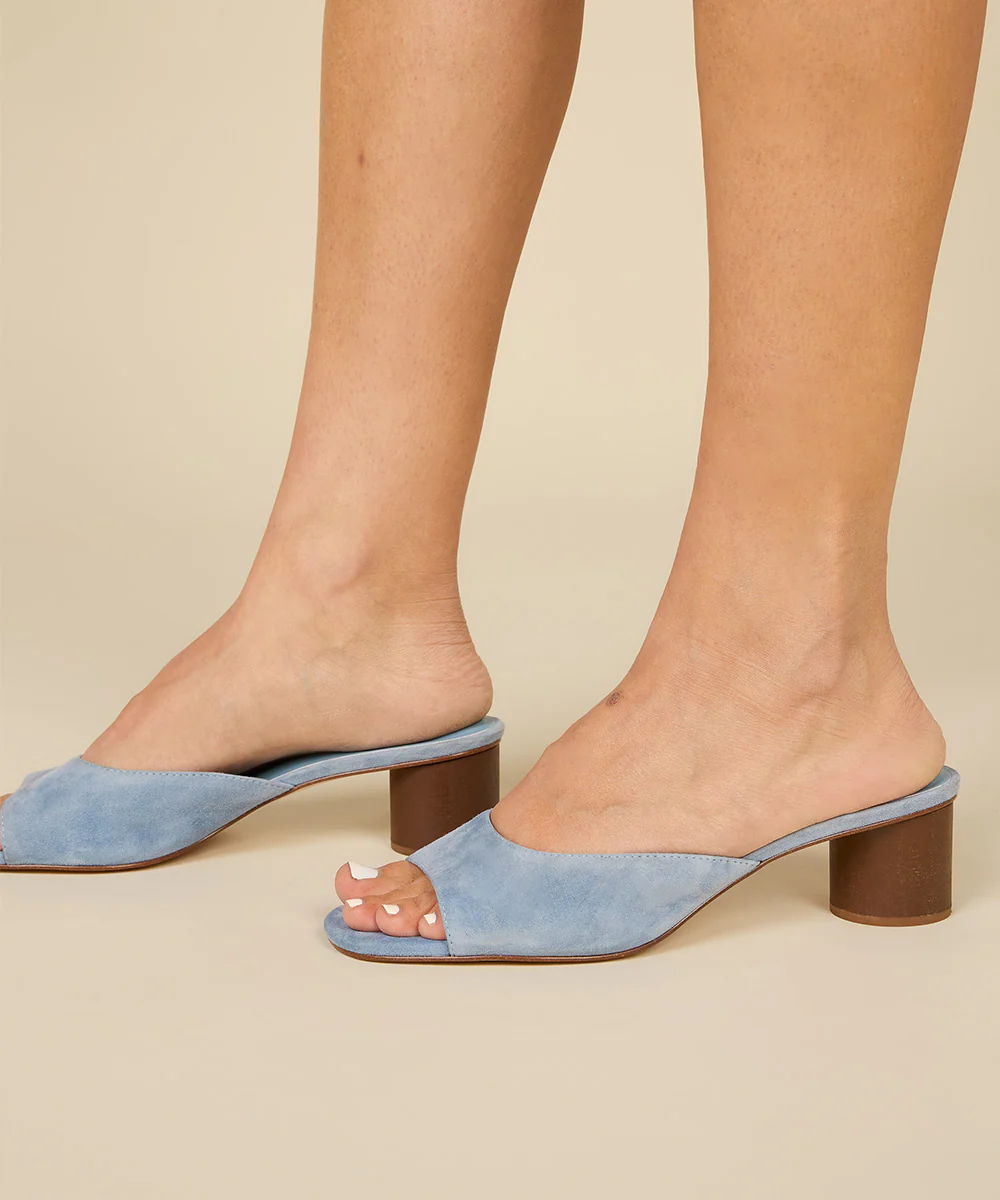 A new open toe low heel with luxe suede uppers and a round wooden heel.